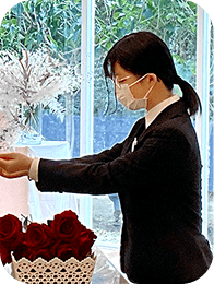 葬儀に欠かせない装花を、仏式、神式、 キリスト教式にわけて、宗教葬における 役割を理論面から学び、生花祭壇をつくる 実習を行います。また供え物としての花 飾りも学びます。