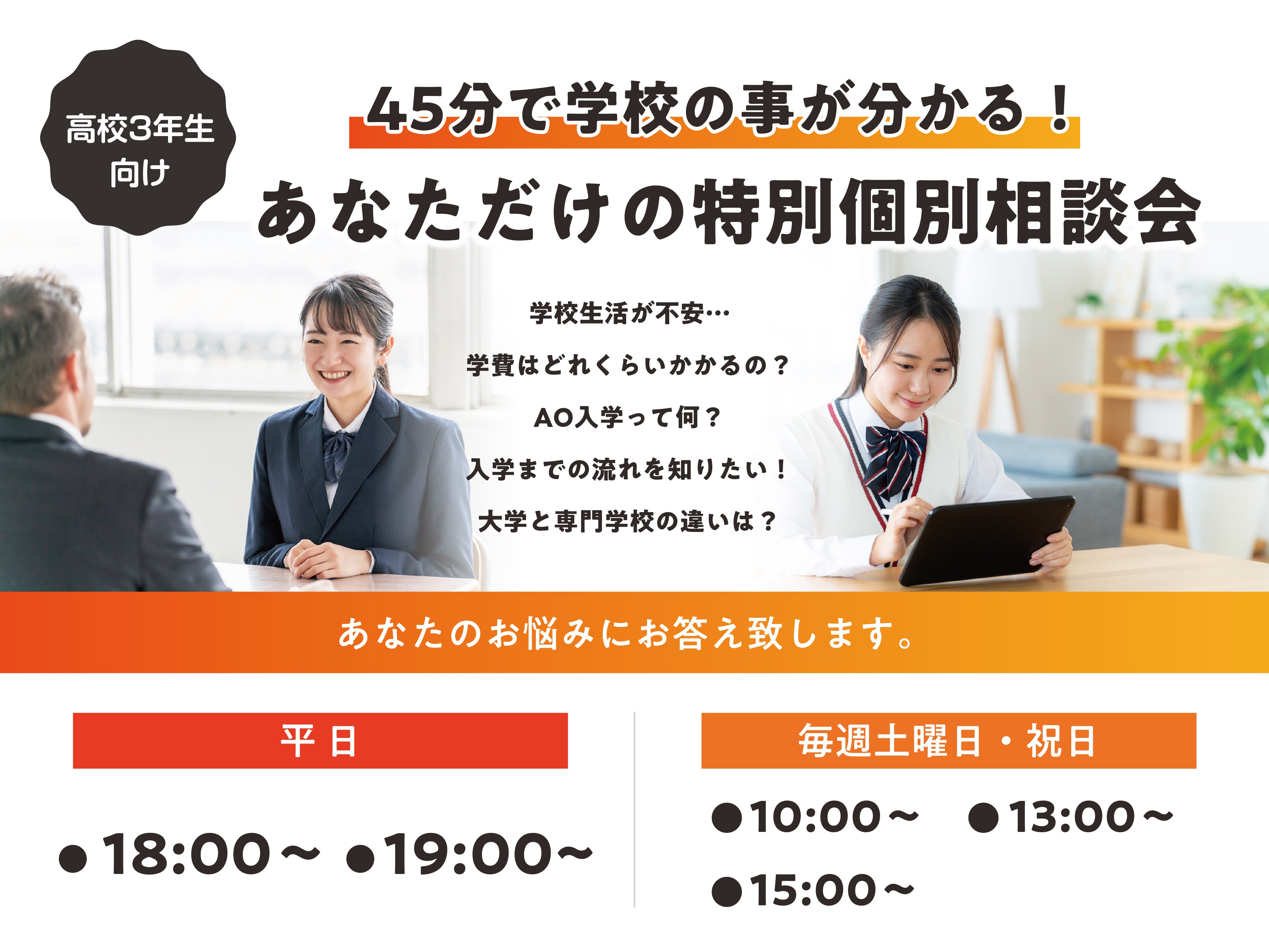 お子様が目指す業界・職業や就職について、入学制度や学費、奨学金制度等保護者の皆さまが抱える疑問や不安に専門スタッフがお答えします。